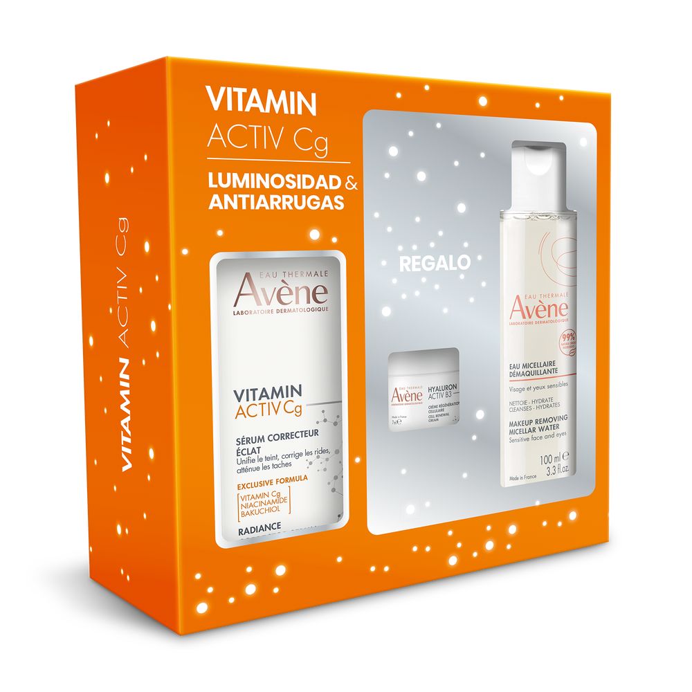 Ingredientes: sérum luminosidad corrector vitamin activ cg: avene thermal spring water (avene aqua). glycerin. niacinamide. pentylene glycol. c9-12 alkane. caprylic/capric triglyceride. pentaerythrityl tetracaprylate/tetracaprate. ascorbyl glucoside. bakuchiol. 1,2-hexanediol. acacia senegal gum. butylene glycol. citric acid. coco-caprylate/caprate. fragrance (parfum). glyceryl behenate. glyceryl dibehenate. sodium citrate. sodium dilauramidoglutamide lysine. sodium hyaluronate. sodium hydroxide. tocopheryl glucoside. tribehenin. water (aqua). xanthan gumhyaluron activ b3 crema:avene thermal spring water (avene aqua). caprylic/capric triglyceride. glycerin. niacinamide. carthamus tinctorius (safflower) seed oil (carthamus tinctorius seed oil). butyrospermum parkii (shea) butter (butyrospermum parkii butter). glycol palmitate. arachidyl alcohol. cetearyl alcohol. cellulose. glyceryl stearate. sodium hyaluronate. adenosine. arachidyl glucoside. behenyl alcohol. caprylyl glycol. cetearyl glucoside. citric acid. fragrance (parfum). helianthus annuus (sunflower) seed oil (helianthus annuus seed oil). sodium benzoate. tocopherol. tocopheryl glucoside. xanthan gumagua micelar: avene thermal spring water (avene aqua). glycerin. pentylene glycol. citric acid. coco-glucoside. ethyl lauroyl arginate hcl. fragrance (parfum). polyglyceryl-4 caprate. polyglyceryl-6 caprylate. trehalose. water (aqua)