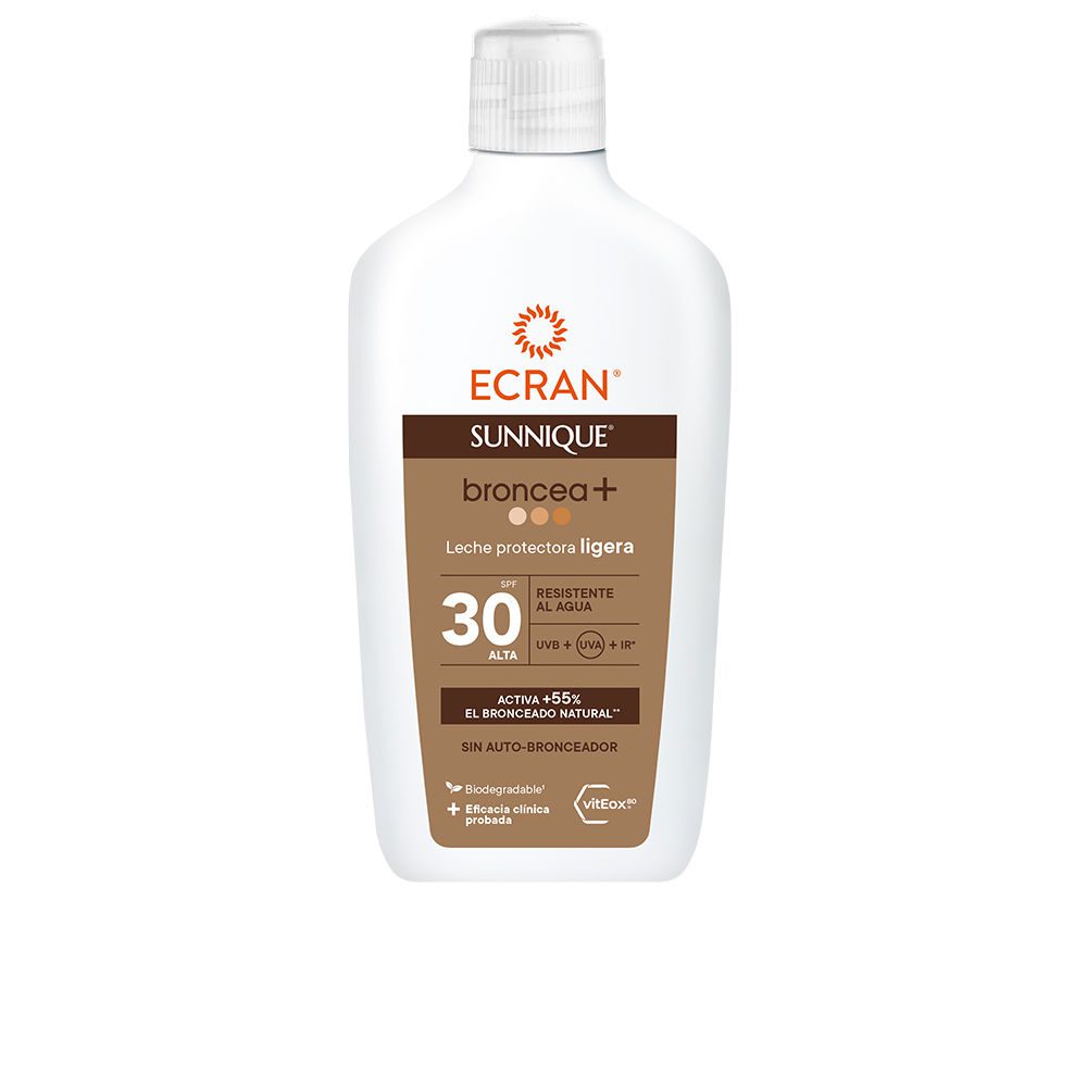ECRAN SUNNIQUE BRONCEA+ Leche Protectora SPF30 es un producto diseñado para cuidar tu piel mientras potencia su bronceado natural. Su fórmula biodegradable contiene vitEox80®, que ofrece protección contra quemaduras solares y refuerza las defensas antioxidantes de la piel gracias a su factor de protección SPF30. La tecnología PureBronze, libre de autobronceador, estimula el bronceado natural en un 55%. Beneficios: – Tu piel se mantendrá hidratada después de cada aplicación.- Obtendrás un bronceado uniforme y radiante.