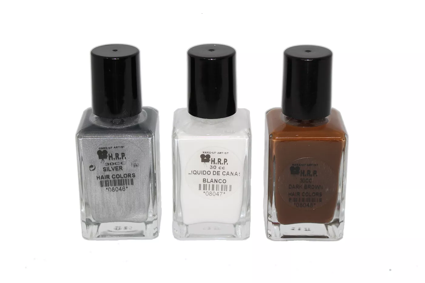 Líquido para la creación de canas temporales. Disponible en envases de 30cc. y en tres colores:blanco y plata para hacer canas, marrón para eliminarlas.