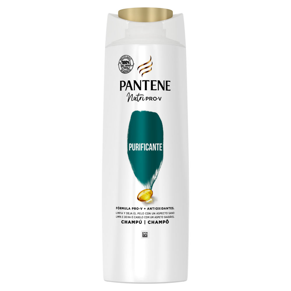 Champú PURIFICANTE de PANTENE. Este producto está diseñado para limpiar en profundidad el cabello y el cuero cabelludo, eliminando residuos acumulados e impurezas. Beneficios: – **Limpieza profunda**: El champú purificante de Pantene está formulado para eliminar eficazmente la acumulación de residuos, como restos de productos capilares, impurezas del entorno y exceso de grasa.- **Cuero cabelludo saludable**: Contribuye a mantener el cuero cabelludo limpio y equilibrado, creando un entorno saludable que favorece el crecimiento de un cabello fuerte y saludable.- **Refrescante**: Ofrece una sensación de frescura y revitalización al cuero cabelludo, dejando una grata sensación de limpieza.